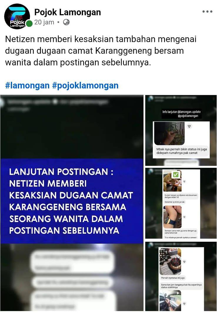 Lamongan, Pusatberitarakyat.com – Dugaan keterlibatan oknum Camat Karanggeneng dalam relasi dengan seorang wanita kian menjadi sorotan publik. Tidak lagi sekadar isu, sejumlah netizen kini mengklaim memiliki bukti tambahan yang memperkuat dugaan tersebut, mulai dari rekaman video, tangkapan layar percakapan, hingga foto-foto yang beredar di media sosial, Facebook Pojok Lamongan. Selasa,(31/03/2026).