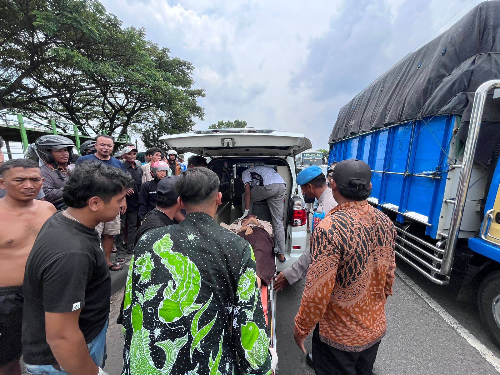 Gerak Cepat Petugas Polsek Babat dan Unit Gakkum Satlantas Polres Lamongan Evakuasi Korban Laka Lantas di Jalan Raya Babat Lamongan.
