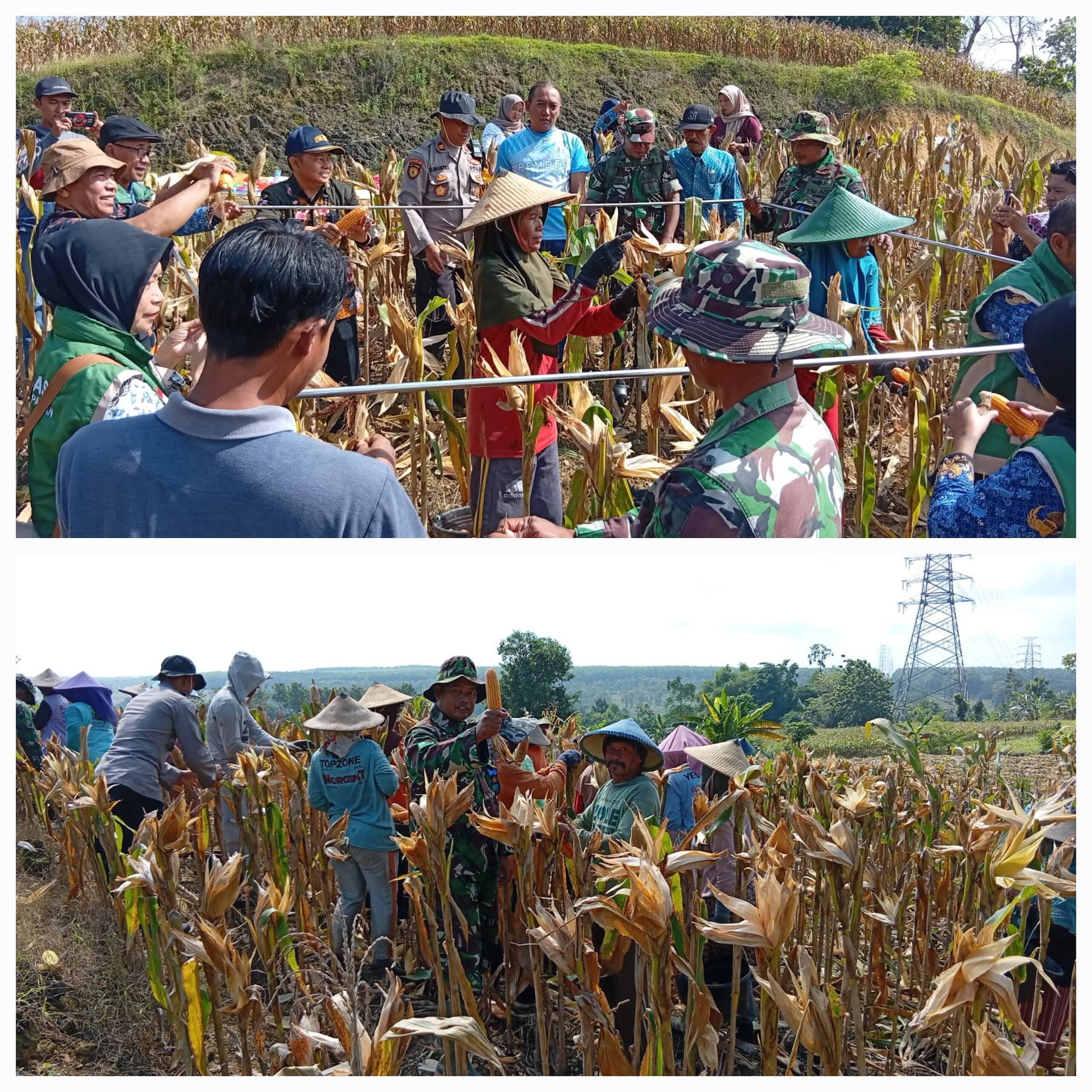 Semangat gotong royong tampak jelas saat para aparat berbaju dinas tidak segan turun ke sawah membantu petani memetik jagung.