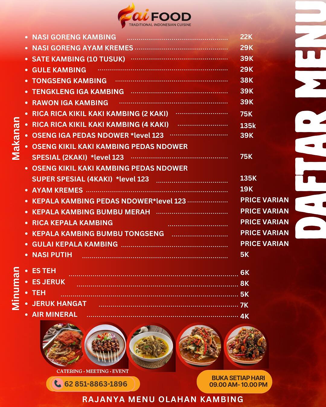 Dengan slogan “Rajanya Menu Olahan Kambing”, FaiFood menargetkan menjadi destinasi kuliner favorit bagi masyarakat Lamongan dan sekitarnya, khususnya bagi para pecinta masakan kambing.