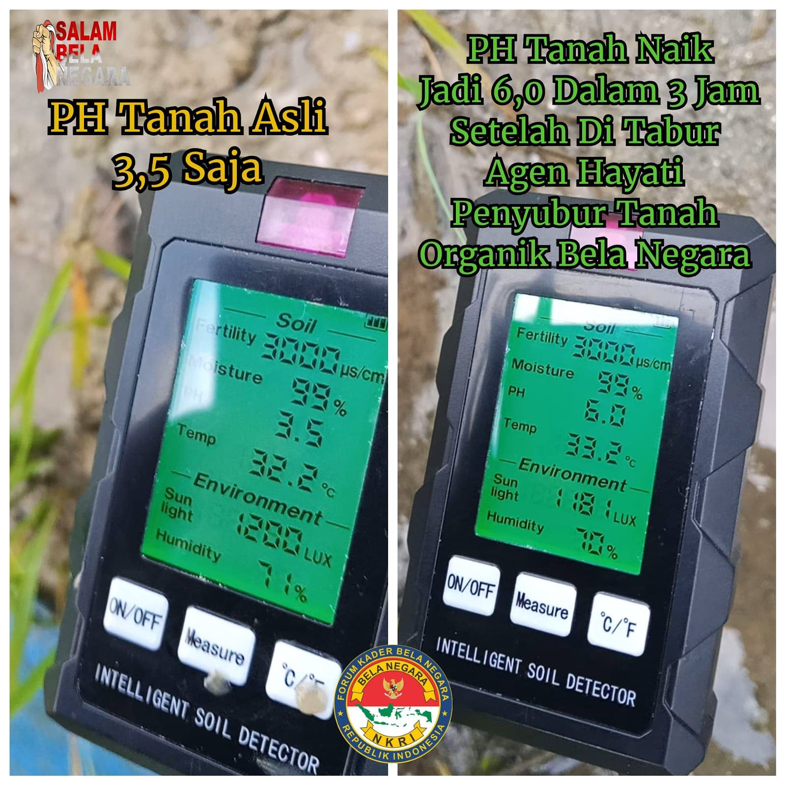Namun, setelah diberikan agen penyubur tanah organik Bela Negara, hasil pengukuran ulang menunjukkan perubahan signifikan. Dalam waktu hanya beberapa jam, pH tanah meningkat menjadi 6,0 atau mendekati kondisi netral yang lebih baik untuk mendukung kesuburan tanah dan produktivitas pertanian.