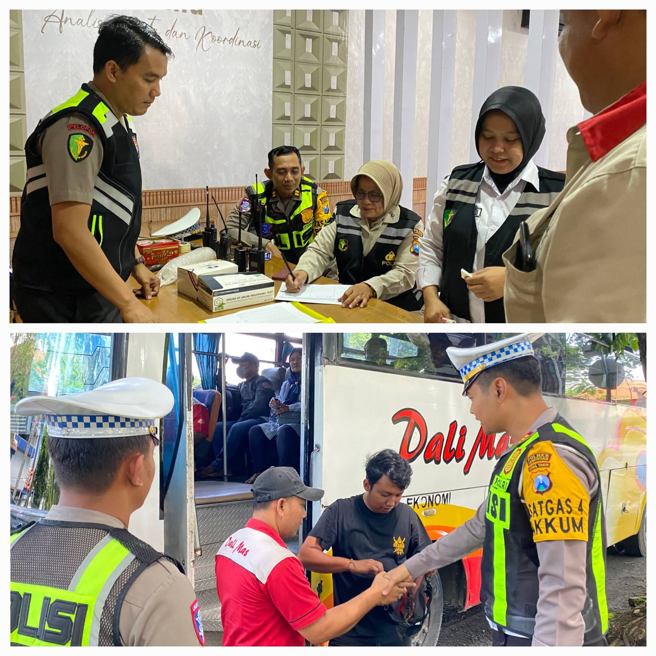 Dalam kegiatan tersebut, petugas melakukan pemeriksaan kelayakan teknis bus penumpang, pengecekan surat-surat kendaraan dan pengemudi, pemberian pembinaan dan penyuluhan Kamseltibcar Lantas kepada awak bus, serta tes urine terhadap sopir bus.